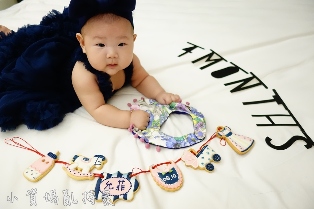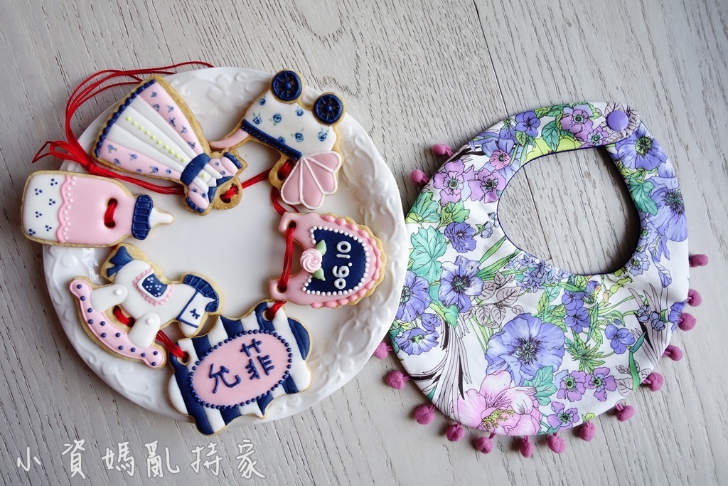 因此堂妹以夜色巴黎的藏青色與粉色為主題,幫我設計了法式優雅版的收涎餅乾