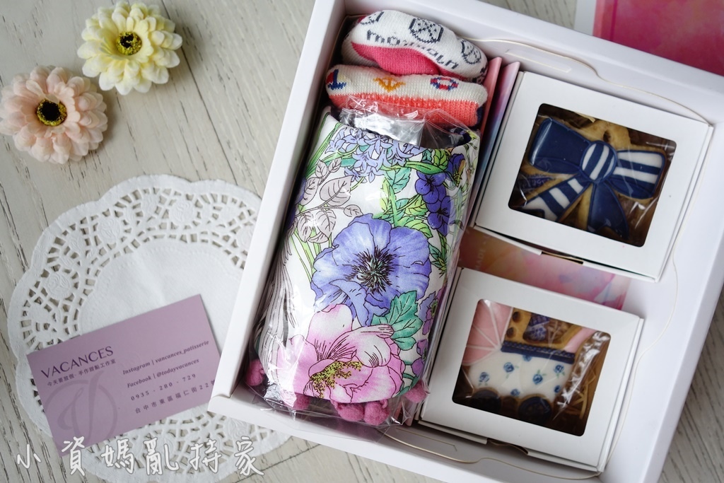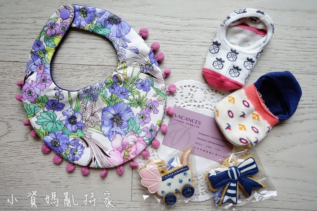 內容物有聯名款圍兜,兩雙底部有止滑的寶寶襪,以及兩塊糖霜餅乾,是漂亮又實用的禮物喔!
