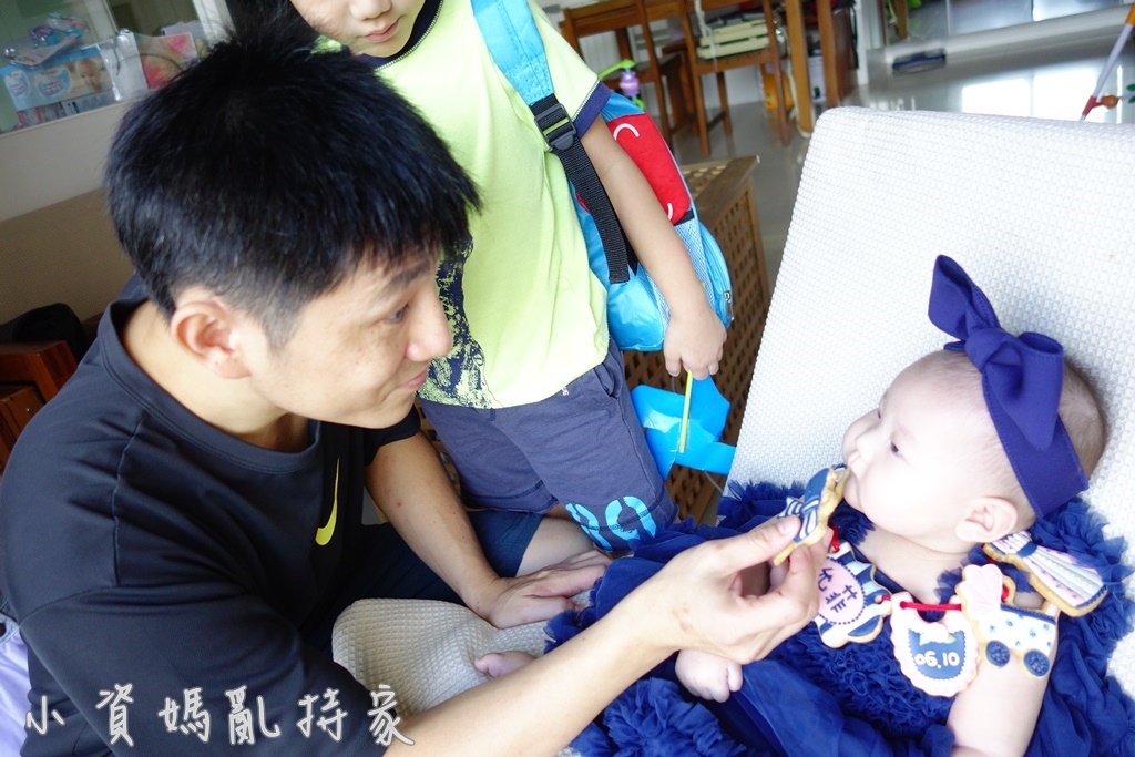 正式收涎開始,阿公阿嬤爸爸媽媽哥哥姊姊,剛好6個人一人一句吉祥話,並用餅乾輕輕劃過菲菲的嘴巴