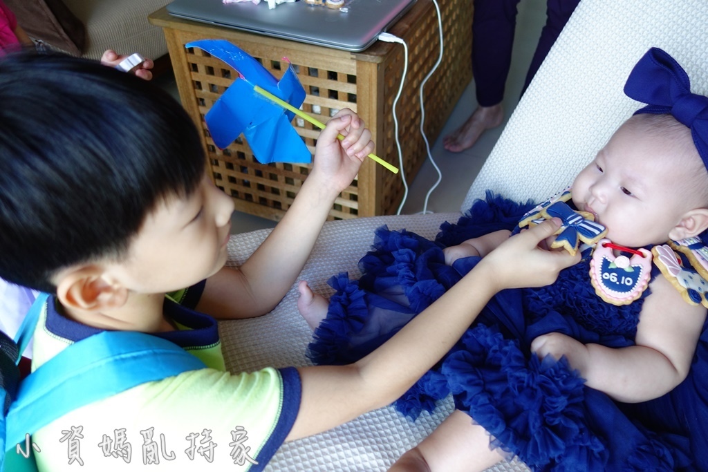 但是拉拉還是比較不受控,請她拿餅乾輕輕擦妹妹嘴巴,她一把抓起餅乾直接塞進妹妹嘴裡XD